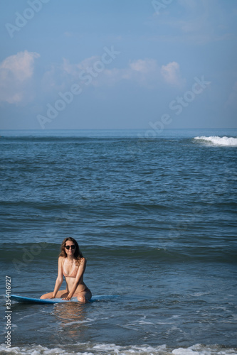 Happy brunette woman sitting on blue surfboard in the ocean. Surfer girl having fun inside ocean during the summer in holiday and activity concept with copy space