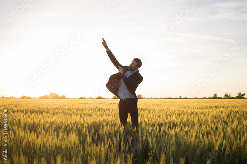 Happy buisinesman having fun in summer fields, man in buisines suit enjoy of freedom, concept of winner manager.