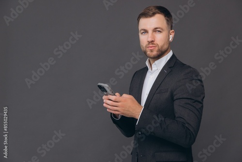 Happy business man smiling businessman professional wearing suit holding cell phone using smartphone mobile app online standing isolated on gray background