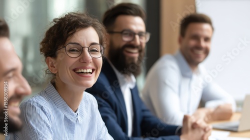 Happy business team working together in a conference room, with the leader smiling and laughing during a meeting at the office table. Suitable for illustrating teamwork and collaboration in corporate