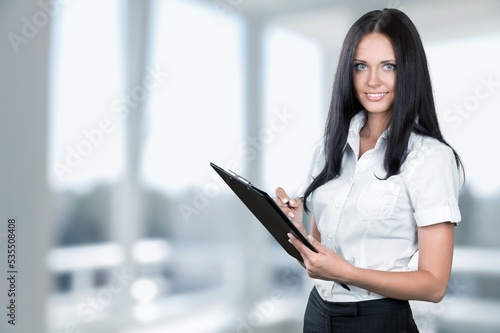 Happy business woman posing in modern office.