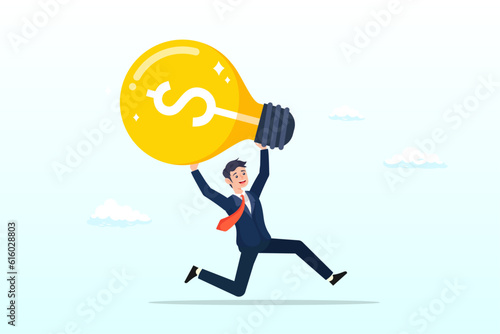 Happy businessman carrying bright light bulb idea with dollar money sign make money from new idea or profit from investment, creativity, innovation to increase earning growth, financial idea (Vector)