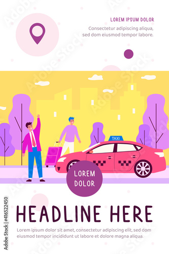 Happy businessman taking taxy. Luggage, cab, transport to airport flat vector illustration. City traffic, travel, transportation concept for banner, website design or landing web page