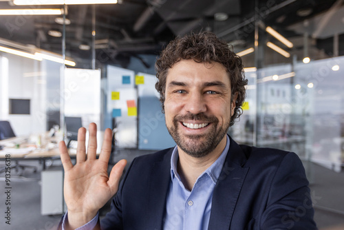 Happy businessman waving looking at camera during video call in modern office. Professional wearing suit interacting with colleagues through phone, showing friendly and welcoming gesture