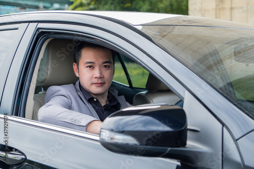 Happy businessman while driving the car and smiling on his morning commute to work. Executive handsome Asian young man on his luxury automobile on the road trip.