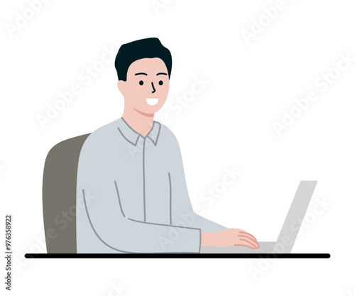 Happy businessman working with laptop. Business, schedule, productivity, management concepts. Flat character vector design illustration.