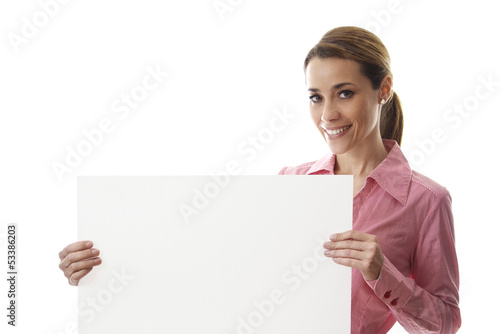 happy businesswoman holding billboard with text space