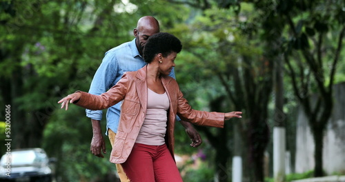 Happy carefree black couple dancing together outside in street