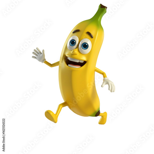 Happy cartoon banana character waving and running