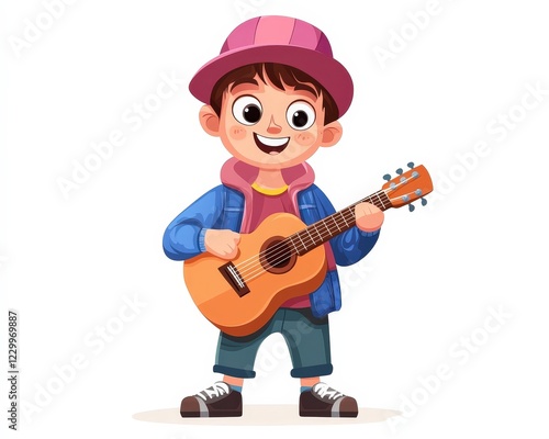 Happy Cartoon Boy Playing Guitar with Colorful Hat and Jacket