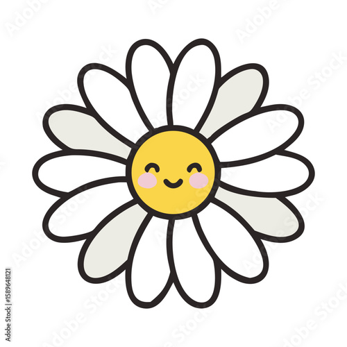 Happy Cartoon Daisy Flower Illustration; Cheerful, Childlike, Spring Theme; White Petals, Yellow Center, Kawaii Style.