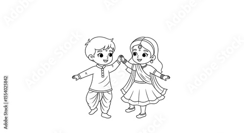 Happy cartoon indian boy and girl in traditional clothing holding hands isolated on transparent background