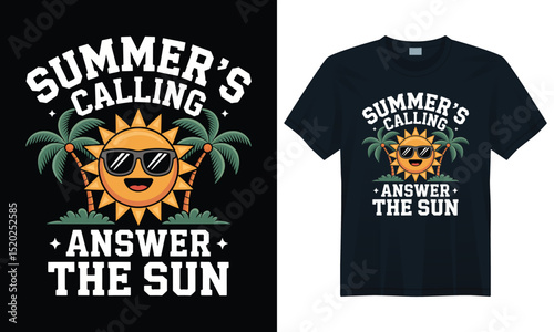 Happy cartoon sun with sunglasses and palm trees in fun tropical summer t-shirt design illustration