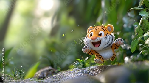 Happy Cartoon Tiger Cub Playing in Vibrant Green Jungle Scene