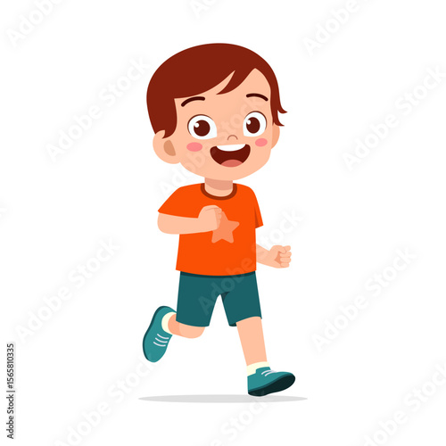 Happy Caucasian Boy Running and Smiling Wearing Orange Star Shirt and Blue Shorts Cartoon Illustration