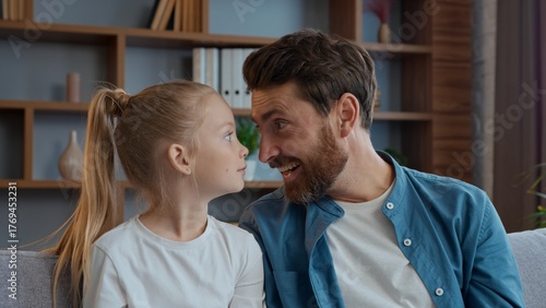 Happy Caucasian family at home father with daughter playing fooling around having fun squint eyes pretend cross-eyed little girl kid child grimacing dad laughing trying funny faces expression laugh