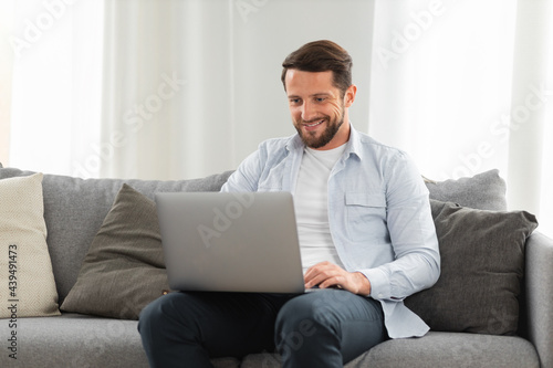 Happy caucasian man uses laptop computer for video call while sitting on sofa at home, smiling caucasian man chatting with friends or family via video conference on social networks