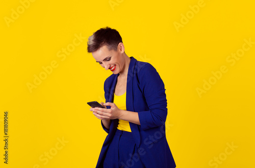 Happy chat. Closeup portrait, happy, brunette girl, smiling, looking at company cell phone, isolated yellow background. Facial expression, reaction. Business woman sending text message from her mobile