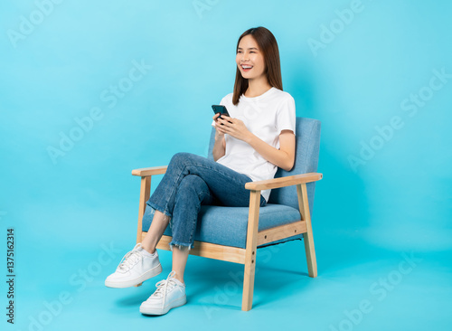 Happy cheerful young woman sitting on the chair and using smartphone on blue background.