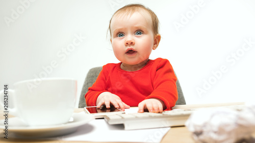 Happy child baby girl toddler sitting with keyboard of computer isolated on a white background