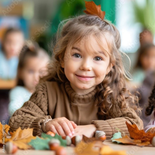 Happy child in classroom with autumn leaves, curly hair, and cute smile. Joyful school scene with seasonal decorations and learning.