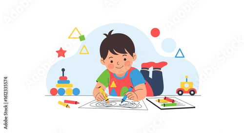 Happy Child Lying on Stomach Drawing Pictures with Crayons Art Activity