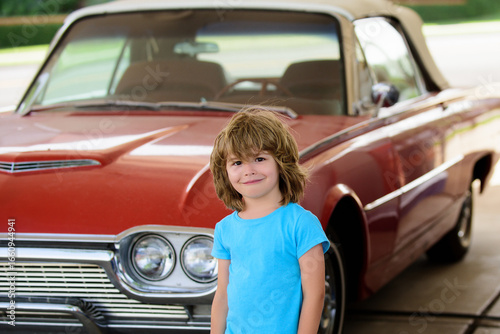 Happy child near vintage car outdoors. Portrait of boy enjoying car ride. Childhood travel moments with classic auto. Kid driver and retro car. Outdoor lifestyle with child and vintage vehicle. Road