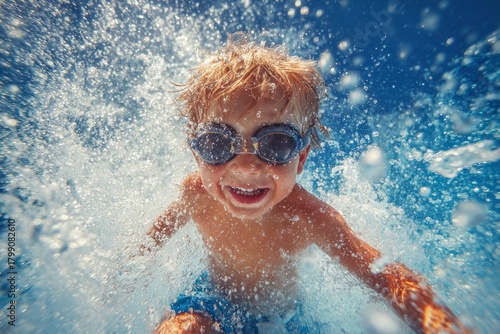 Happy Child Playing in Water Splash with Swim Goggles and Smiling