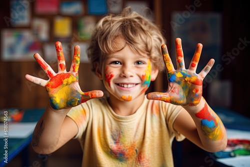Happy child showing hands covered in paint after painting at art class. Generative Ai image