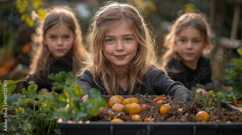 Happy children harvesting vegetables in a community garden, celebrating teamwork and the joys of nature in the golden light of the afternoon