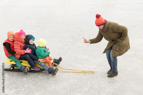 happy children in colorful clothes came with their parents to ride a sled. Emotional children enjoy a sunny afternoon and glide along the frozen lake's ice