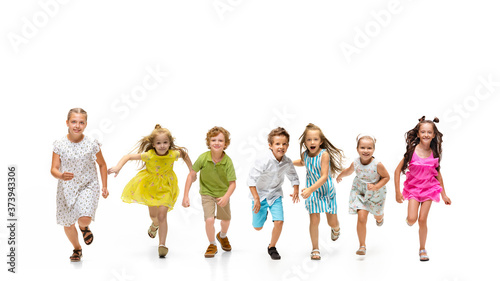 Happy children, little and emotional caucasian kids jumping and running isolated on white background. Looks happy, cheerful, sincere. Copyspace for ad. Childhood, education, happiness concept.