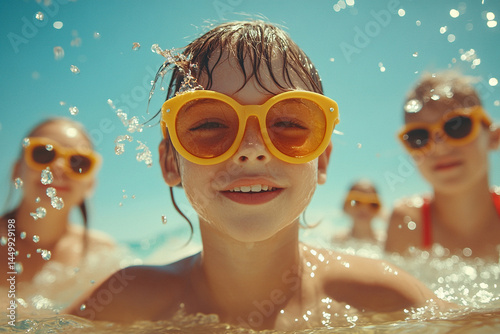 Happy children playing in the sea. Children in sunglasses having fun outdoors.