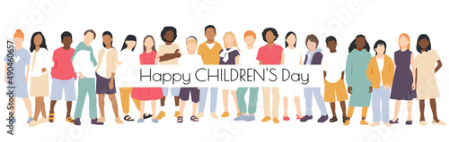 Happy Children's Day card. Children of different ethnicities stand side by side together. Flat vector illustration.