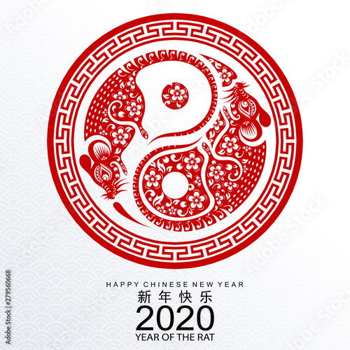 Happy chinese new year 2020 year of the rat ,paper cut rat character,flower and asian elements with craft style on background. (Chinese translation : Happy chinese new year 2020, year of rat)