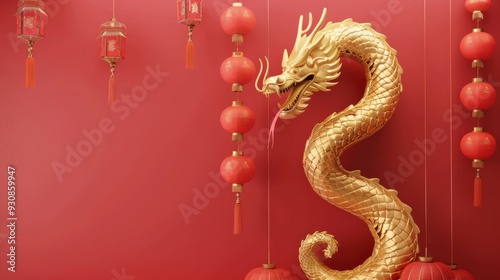 Happy chinese new year, year of the snake zodiac sign hanging beautiful lantern and flowers on red background.