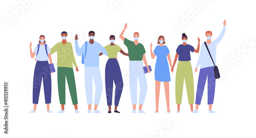 Happy college student crowd. Vector flat creative illustration. Diverse ethnic male and female group. Multiethnic young adult boy and girls with backpack and book in protective face mask.