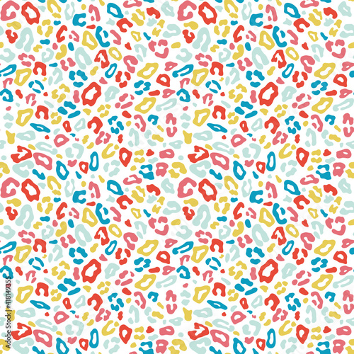 Happy colorful leopard skin spots in pink, green, yellow and red colors on white background. Vektor seamless pattern for kids fashion, T-shirts, fabrics, decorations, covers, wrapping, backdrops.