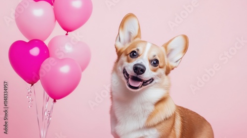 Happy corgi portrait with heart shaped balloons on pink background in studio. Concept for Valentine's day Banner