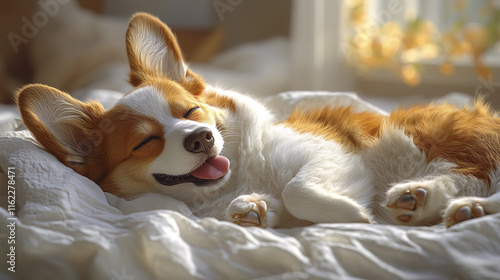 happy corgi sleeping peacefully on cozy bed, snoring softly