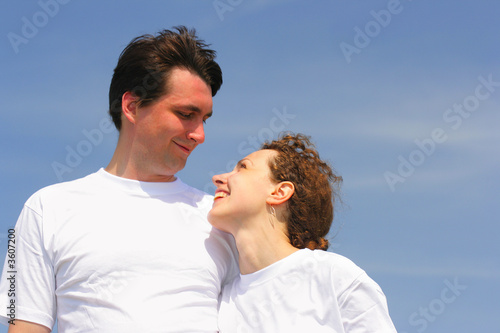 Happy couple clothed in white t-shirts against a blue sky