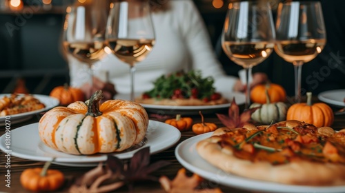 Happy couple enjoying a Halloween feast, table adorned with traditional seasonal dishes, emphasizing the festive and communal aspects of the holiday