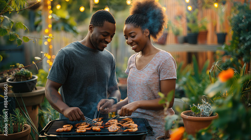 Happy Couple Enjoying Outdoor Barbecue Party in Home Garden