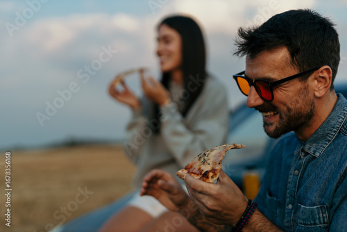 Happy couple enjoying pizza outdoors at sunset during road trip