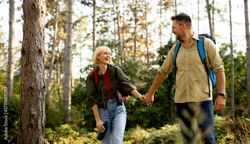 Happy couple hiking through a forest trail while holding hands in the bright sunlight during a warm afternoon