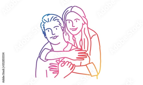 Happy couple hugs each other. Rainbow colors in linear vector illustration.