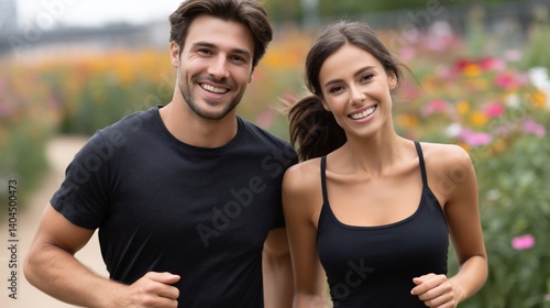 Happy couple jogging outdoors, smiling brightly