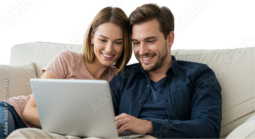 Happy Couple Laughing Together With Laptop On Sofa Transparent PNG