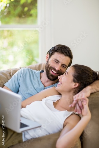 Happy couple lying on sofa and using laptop