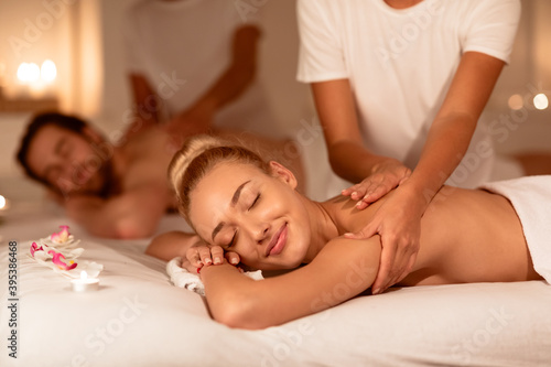 Happy Couple Relaxing Lying In Luxury Spa Receiving Back Massage